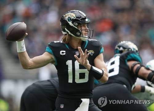 Jacksonville Jaguars quarterback Trevor Lawrence (16) pass the ball during the first half of an NFL football game between the Miami Dolphins and the Jacksonville Jaguars at the Tottenham Hotspur stadium in London, England, Sunday, Oct. 17, 2021. (AP Photo/Ian Walton)