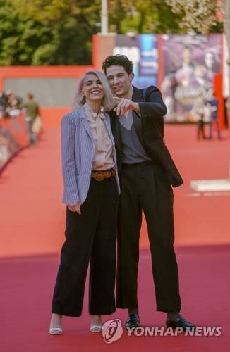 Director Eva Husson, left, and actor Josh O'Connor pose during a photo call for the movie 'Motherin Sunday' on the red carpet at the 16th edition of the Rome Film Fest in Rome, Sunday, Oct. 17, 2021. (AP Photo/Domenico Stinellis)