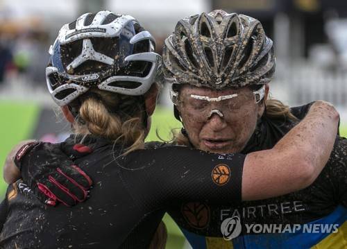 epaselect epa09528369 Womens Team Fairtree Jennie Stenerhag (R) of Sweden and Amy McDougall (L) of South Africa finish the Prolog of the 2021 Absa Cape Epic mountain bike stage race held on Table Mountain, Cape Town, South Africa, 17 October 2021. This years event sees 600 riders tackle 620 kilometres over 8 days of riding and 15 350 metres of vertical ascent. The race includes UCI pro riders and amateur's in what is seen by many as the premier MTB stage race in the world. EPA/KIM LUDBROOK