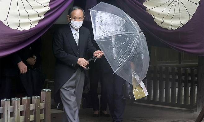 | 반성 않는 日 17일 스가 요시히데 전 일본 총리가 태평양전쟁 A급 전범이 합사된 도쿄 야스쿠니신사 참배를 마친 뒤 떠나고 있다. 도쿄=AP연합뉴스 |
