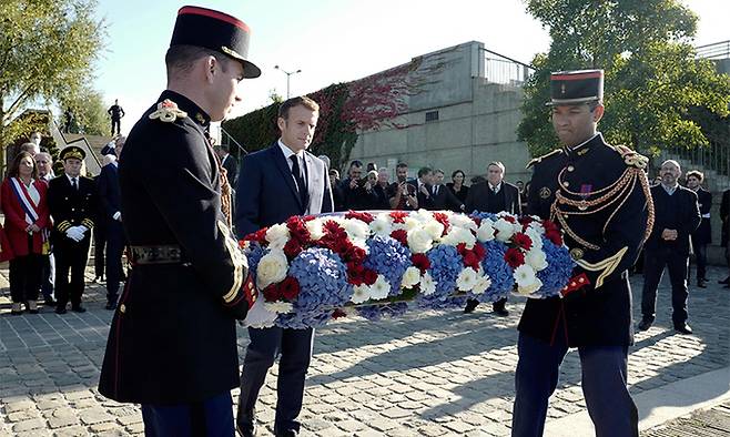 | 사과하는 佛 지난 16일(현지시간) 에마뉘엘 마크롱 프랑스 대통령(가운데)이 파리 센강변에서 열린 ‘파리 학살’ 60주기 추모식에 참석해 헌화하는 모습. 파리 학살은 1961년 당시 프랑스 식민지였던 알제리 출신 시민들의 반프랑스 시위를 경찰이 잔인하게 진압해 수십명이 숨지고 시신 일부가 센강에 유기된 사건이다. 마크롱 대통령은 추모사에서 이를 “용서할 수 없는 범죄”로 규정했다. 파리=AFP연합뉴스 |