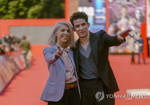 Director Eva Husson, left, and actor Josh O'Connor pose during a photo call for the movie 'Motherin Sunday' on the red carpet at the 16th edition of the Rome Film Fest in Rome, Sunday, Oct. 17, 2021. (AP Photo/Domenico Stinellis)