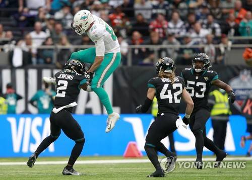 Miami Dolphins tight end Mike Gesicki (88) is tackled by Jacksonville Jaguars free safety Rayshawn Jenkins (2) an NFL football game between the Miami Dolphins and the Jacksonville Jaguars at the Tottenham Hotspur stadium in London, England, Sunday, Oct. 17, 2021. (AP Photo/Ian Walton)