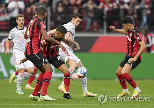 Bayern's Robert Lewandowski, centre, challenges for the ball with Bayern's Leroy Sane, centre left, during the German Bundesliga soccer match between Bayer Leverkusen and Bayern Munich in Leverkusen, Germany, Sunday, Oct. 17, 2021. (AP Photo/Martin Meissner) The deutsche fussball liga dfl does not allow the images to be used as sequences to emulate video.