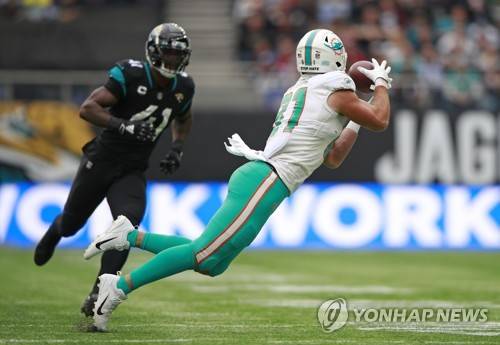 Miami Dolphins tight end Durham Smythe (81) catches the ball during an NFL football game between the Miami Dolphins and the Jacksonville Jaguars at the Tottenham Hotspur stadium in London, England, Sunday, Oct. 17, 2021. (AP Photo/Ian Walton)