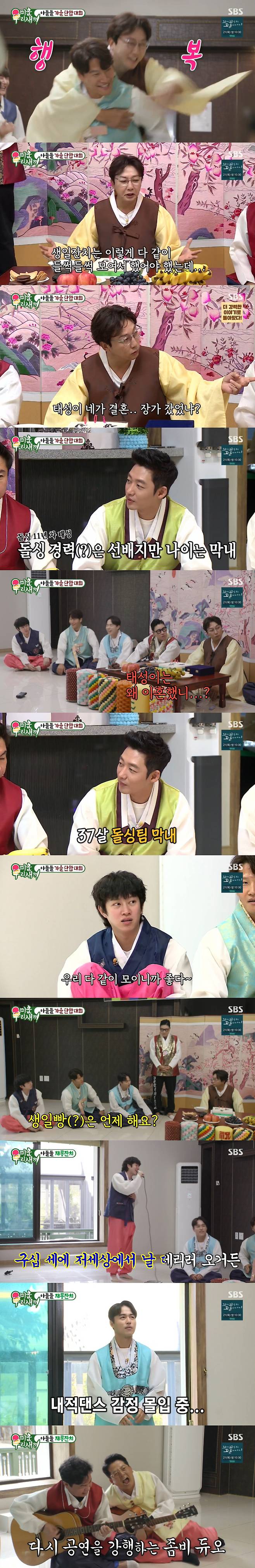이어 '잔치의 꽃'이라 불리는 아들들의 초특급 재롱잔치가 시작됐다. 김희철은 "탁재훈 큰 형님 오래 건강하세요"라며 '백세인생'을 열창, 이어 오민석과 이태성, 김종국은 내적댄스로 웃음을 안겼다. 또한 박군은 기왓장 격파쇼, '포기를 모르는 남자' 김준호는 임원희의 기타 반주에 맞춰 좀비 개그를 선보이며 모두를 초토화시켰다.