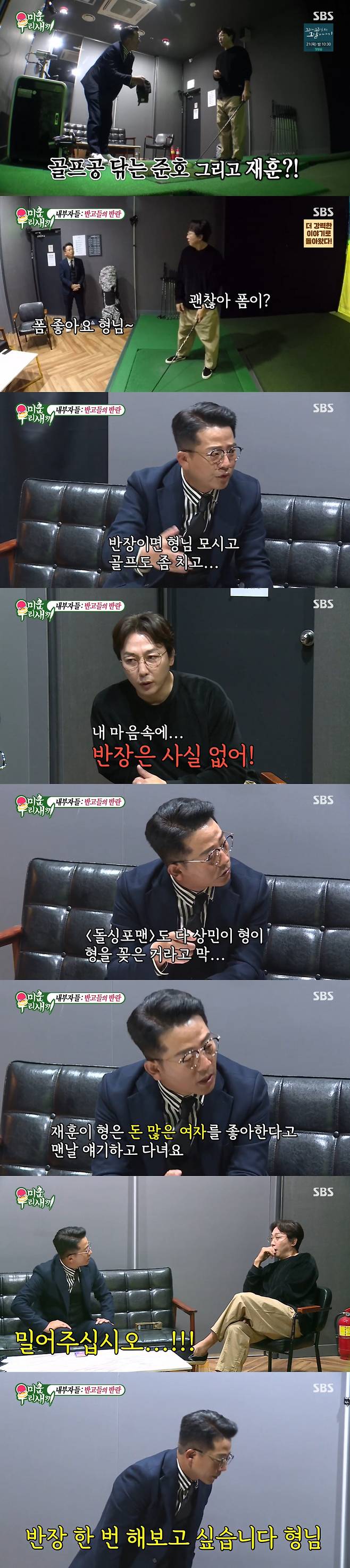 김준호는 "폼도 좋고 프로선수다"며 칭찬 한 뒤, "상민이 형 골프 안 치죠? 상민이 형이 반장이면 형님 모시고 골프도 치고"라며 슬슬 본론을 꺼냈다. 탁재훈은 "상민이가 아직도 반장을 하고 있나?"라면서 "내가 없었다. 그래서 내 마음 속에 반장은 사실 없다"고 했다.