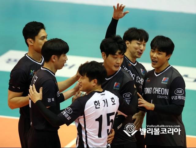 【발리볼코리아닷컴(충북 단양)=김경수 기자】 17일(일) 충북 단양군 단양국민체육센터에서 열린 2021 신협중앙회장배 실업배구종합선수권대회 남자부 영천시체육회 vs 국군체육부대 경기에서 영천시체육회 선수들이 공격을 성공시키고 기뻐하고 있다. 이번대회는 총 9개팀이 참가한 가운데 10월 16일(토) 부터 20일(수) 까지 충북 단양국민육센터에서 열린다. 2021.10.17.