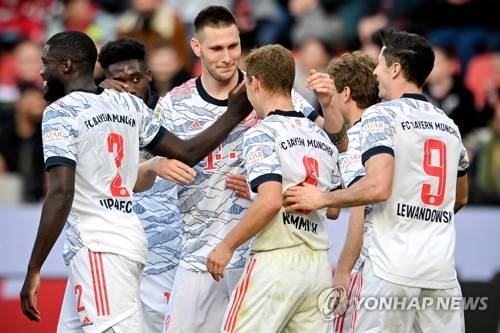 epa09528615 Bayern's Niklas Suele (3-L) celebrates with his teammates after scoring the 3-0 lead during the German Bundesliga soccer match between Bayer Leverkusen and FC Bayern Muenchen at BayArena in Leverkusen, Germany, 17 October 2021. EPA/SASCHA STEINBACH CONDITIONS - ATTENTION: The DFL regulations prohibit any use of photographs as image sequences and/or quasi-video.