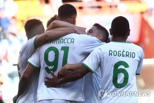 epa09528618 Sassuolo's Gianluca Scamacca (2-L) celebrates with teammates after scoring during the Italian Serie Serie A match Genoa CFC vs US Sassuolo Calcio at Luigi Ferraris stadium in Genoa, Italy, 17 October 2021. EPA/LUCA ZENNARO