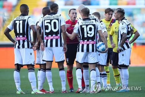 epa09528623 Referee Abisso shows the red card to Udinese's Roberto Pereyra (R) during the Italian Serie A soccer match Udinese Calcio vs Bologna FC at the Friuli - Dacia Arena stadium in Udine, Italy, 17 October 2021. EPA/GABRIELE MENIS