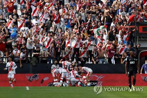 epa09528629 Rayo Vallecano's players celebrate after scoring a goal during the Spanish LaLiga soccer match between Rayo Vallecano and Elche CF at Estadio de Vallecas stadium, in Madrid, Spain, 17 October 2021. EPA/J.J. Guillen