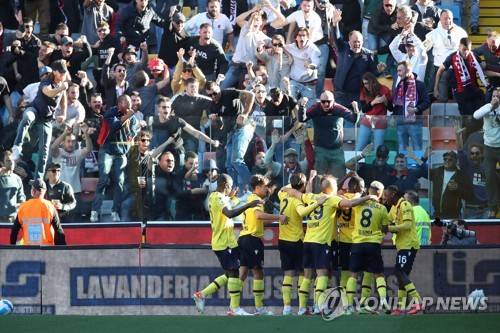 epa09528653 Bologna?s Musa Barrow (C) jubilates with his teammates after scoring during the Italian Serie A soccer match Udinese Calcio vs Bologna FC at the Friuli - Dacia Arena stadium in Udine, Italy, 17 October 2021. EPA/GABRIELE MENIS