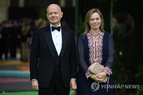 epa09528907 British politician William Haig (L) and his wife Ffion (R) arrive on the green carpet for the inaugural Earthshot Prize ceremony at Alexandra Palace in London, Britain, 17 October 2021. The Earthshot Prize will awarded by The Royal Foundation every year until 2030, to 'five winners each year whose solutions substantially help the environment.' EPA/NEIL HALL