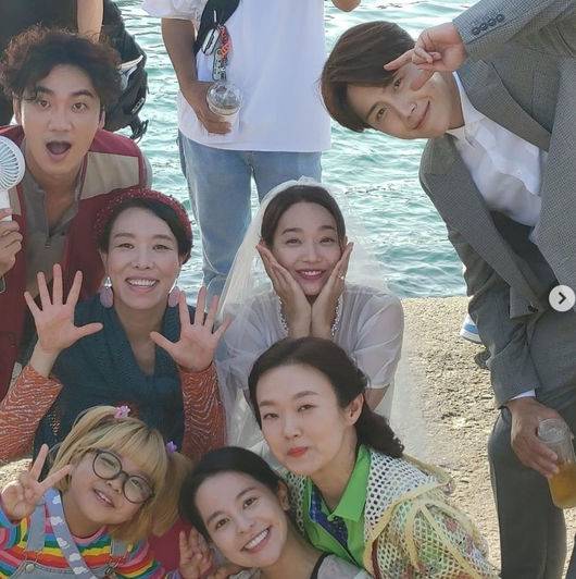 공개된 사진 속에서 신민아는 '갯마을 차차차' 마지막 회의 웨딩드레스를 입고 함께 연기한 배우들 김선호, 윤석현, 차청화, 공민정, 이봉련 등과 함께 단체 사진을 남겨 눈길을 끌었다.
