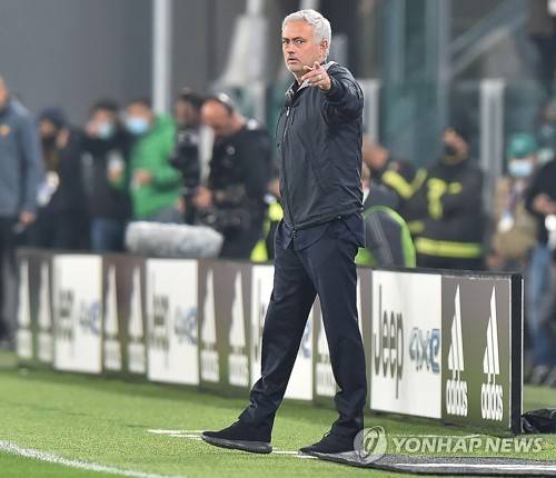 epa09529260 Roma?s coach Jose Mourinho reacts during the Italian Serie A soccer match Juventus FC vs AS Roma at Allianz Stadium in Turin, Italy, 17 october 2021. EPA/ALESSANDRO DI MARCO