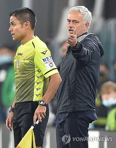 epa09529261 Roma?s coach Jose Mourinho reacts during the Italian Serie A soccer match Juventus FC vs AS Roma at Allianz Stadium in Turin, Italy, 17 october 2021. EPA/ALESSANDRO DI MARCO