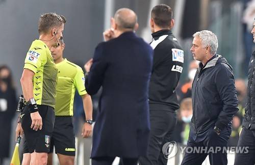 epa09529284 Roma?s coach Jose Mourinho (R) talks with referee Daniele Orsato during of the Italian Serie A soccer match Juventus FC vs AS Roma at Allianz Stadium in Turin, Italy, 17 october 2021. EPA/ALESSANDRO DI MARCO