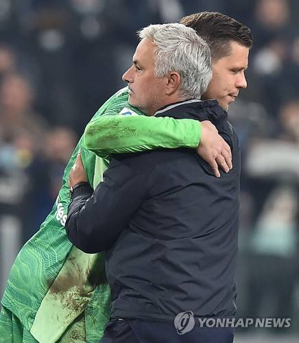 epa09529288 Roma?s coach Jose Mourinho (R) greets Juventus' goalkeeper Wojciech Szczesny at the end of the Italian Serie A soccer match Juventus FC vs AS Roma at Allianz Stadium in Turin, Italy, 17 october 2021. EPA/ALESSANDRO DI MARCO