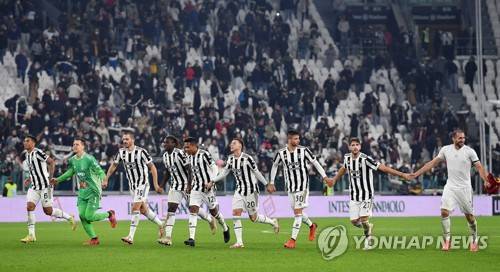 epa09529290 Players of Juventus celebrate the victory at the end of the Italian Serie A soccer match Juventus FC vs AS Roma at Allianz Stadium in Turin, Italy, 17 october 2021. EPA/ALESSANDRO DI MARCO