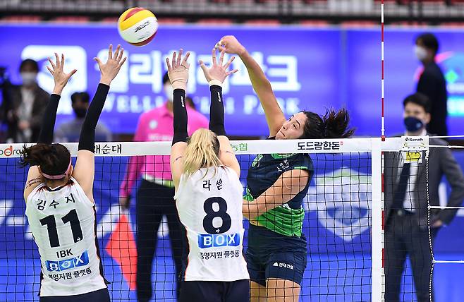 트리플 크라운이라는 기록처럼 다채로운 공격이 돋보였다. 타점 높은 공격에 강한 서브로 기업은행을 폭격했다.