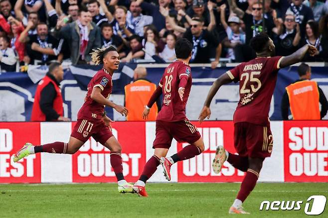 (보르도 AFP=뉴스1) 우동명 기자 = 보르도의 황의조가 17일(현지시간) 프랑스 보르도의 누보 스타드 드 보르도에서 열린 프랑스 프로축구 리그1 낭트와 경기서 선제골인 시즌 4호 골을 넣고 동료 선수들과 기뻐하고 있다.