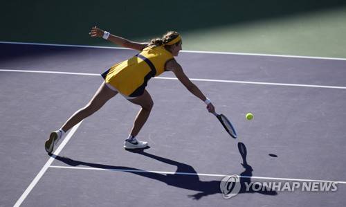 epa09529407 Victoria Azarenka of Belarus hits a return to Paula Badosa of Spain during the women's final at the BNP Paribas Open tennis tournament at the Indian Wells Tennis Garden in Indian Wells, California, USA, 17 October 2021. EPA/RAY ACEVEDO