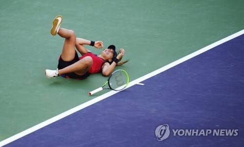 epa09529413 Paula Badosa of Spain reacts after defeating Victoria Azarenka of Belarus during the women's final at the BNP Paribas Open tennis tournament at the Indian Wells Tennis Garden in Indian Wells, California, USA, 17 October 2021. EPA/RAY ACEVEDO
