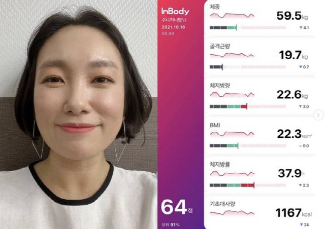 정경미는 최근 몸무게가 63.6kg까지 올랐다며 만보 걷기에 돌입했다고 전한 바. 이날 공개한 인바디 결과에 따르면 현재 59.5kg로, 약 4kg 감량에 성공했음을 알 수 있다. 정경미는 "더 열심히 걷고 근력운동도 시작해야지!"라며 다시금 다이어트 열의를 보였다.