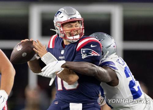 epa09529422 New England Patriots quarterback Mac Jones (L) reacts as he is hit by Dallas Cowboys safety Jayron Kearse (R) during fourth quarter of the NFL American Football game between the Dallas Cowboys and New England Patriots at Gillette Stadium in Foxborough, Massachusetts, USA, 17 October 2021. EPA/CJ GUNTHER