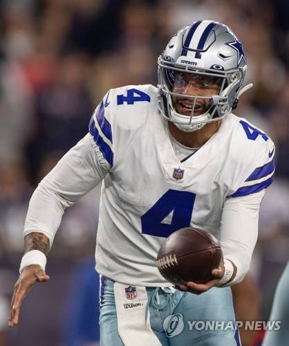 epa09529419 Dallas Cowboys quarterback Dak Prescott looks to hand off the ball during third quarter of the NFL American Football game between the Dallas Cowboys and New England Patriots at Gillette Stadium in Foxborough, Massachusetts, USA, 17 October 2021. EPA/CJ GUNTHER