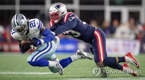 epa09529423 Dallas Cowboys running back Ezekiel Elliott (L) is knocked down by New England Patriots middle linebacker Kyle Van Noy (R) during fourth quarter of the NFL American Football game between the Dallas Cowboys and New England Patriots at Gillette Stadium in Foxborough, Massachusetts, USA, 17 October 2021. EPA/CJ GUNTHER