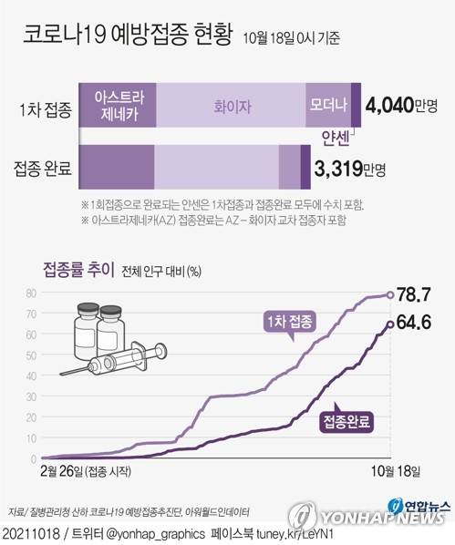 (서울=연합뉴스) 장예진 기자 = 코로나19 예방접종대응추진단은 18일 0시 기준으로 전체 인구대비 접종률이 1차 접종 완료자는 78.7%, 접종 완료자는 64.6%라고 밝혔다.
