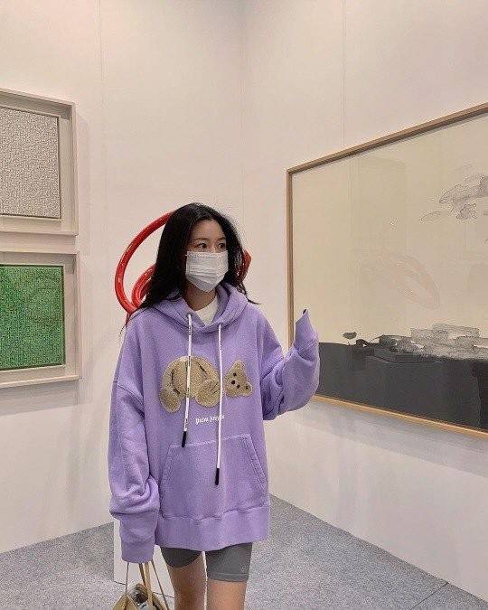 공개된 사진에서 이다인은 연보라색 후드티에 바이커 쇼츠를 매치한 패션을 선보였다.