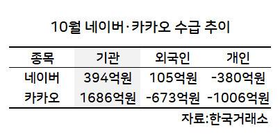 하지만 이달 들어 기관 투자자들의 움직임이 달라졌다. 기관은 이달 초 이후 약 2주간 네이버를 395억원, 카카오를 1686억원을 순매수했다.
