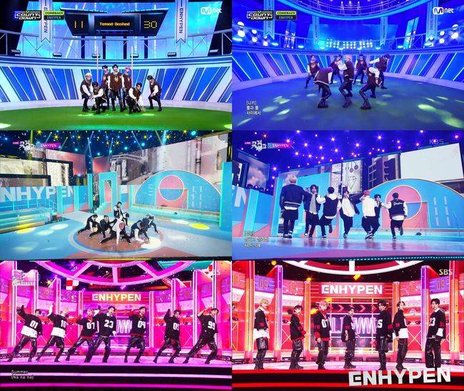 지난 12일 데뷔 후 첫 정규 앨범 'DIMENSION : DILEMMA'를 발표한 ENHYPEN(정원, 희승, 제이, 제이크, 성훈, 선우, 니키)은 14일 Mnet '엠카운트다운'을 시작으로 KBS2TV '뮤직뱅크', SBS '인기가요'에 연이어 출연해 신곡 'Tamed-Dashed' 무대를 펼쳤다.