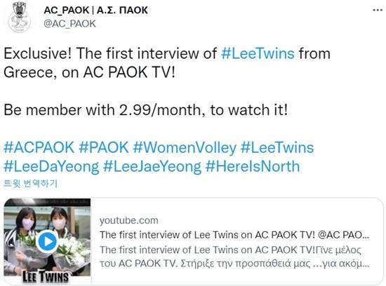 PAOK는 지난 17일(이하 한국시간) 트위터에 "매달 2.99 유로(약 4100원)를 내면, AC PAOK TV의 회원이 될 수 있다. 쌍둥이 자매의 첫 인터뷰를 AC PAOK TV에서 독점으로 다뤘다"라고 전했다.