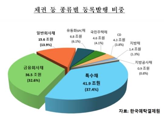 채권 등 종류별 등록 발행 규모는 국민주택채 4조 6천억원, 지방채 1조 4천억원, 금융회사채 및 SPC채를 포함한 회사채 58조 9천억원, 특수채 41조 9천억원, 지방공사채 9천억원, CD는 4조 3천억원이 발행되었다. 종류별 등록 발행 비중은 특수채(37.4%), 금융회사채(32.6%), 일반회사채(13.9%), SPC채(6.1%), 국민주택채(4.1%), CD(3.8%), 지방채(1.3%), 지방공사채(0.8%) 순이었다.