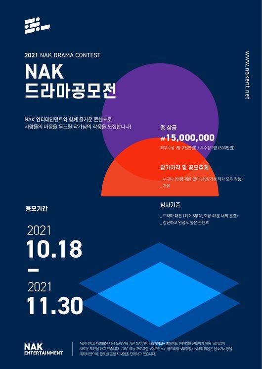 '2021 NAK 드라마 공모전' 관련 상세 내용은 NAK엔터테인먼트 공식 홈페이지에서 확인할 수 있다.