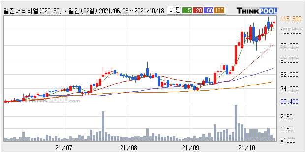 '일진머티리얼즈' 52주 신고가 경신, 단기·중기 이평선 정배열로 상승세