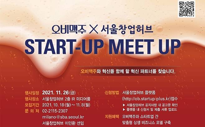서울시의 대표 창업지원 기관인 서울창업허브(SBA 운영, 대표이사 직무대행 박대우)가 오비맥주(대표이사 배하준)와 손잡고 ‘오비맥주 x SEOUL START-UP MEET-UP’ 프로그램에 참여할 스타트업을 모집한다고 18일 밝혔다. 서울창업허브는 대기업과 스타트업간의 사업화 연계를 통한 기술 성장, 경쟁력 강화를 위해 오비맥주와 업무협약을 체결하고, 협업 비즈니스모델을 구축하여 3년째 프로그램을 진행해 오고 있다.