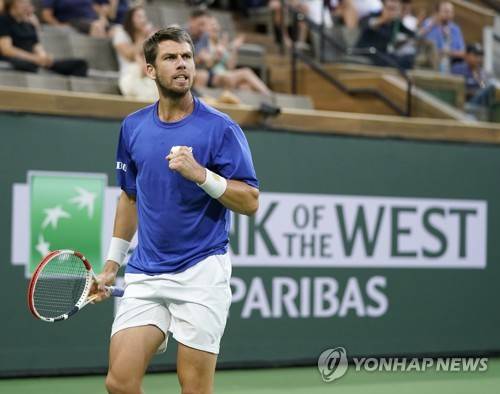 epa09529499 Cameron Norrie of Great Britain reacts as he plays Nikoloz Basilashvili of Gerogia during the men's final at the BNP Paribas Open tennis tournament at the Indian Wells Tennis Garden in Indian Wells, California, USA, 17 October 2021. EPA/RAY ACEVEDO ALTERNATE CROP