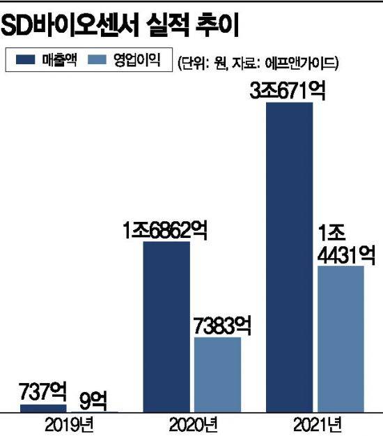 SD바이오센서의 매출액은 2019년 737억원에서 코로나19 사태 1년 만인 지난해 1조6862억원으로 22.8배 치솟았다. 올해 역시 실적 호조세가 이어져 상반기 매출액 1조9595억원, 영업이익 9667억원을 기록했다. 올 연간 매출액은 3조671억원이 예상된다.