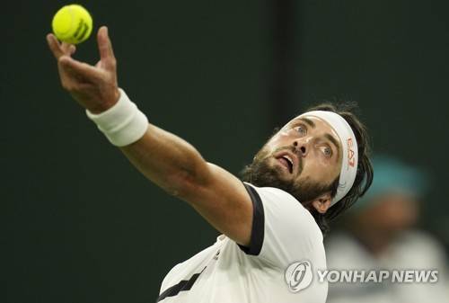 epa09529517 Nikoloz Basilashvili of Georgia serves to Cameron Norrie of Great Britain during the men's final at the BNP Paribas Open tennis tournament at the Indian Wells Tennis Garden in Indian Wells, California, USA, 17 October 2021. EPA/RAY ACEVEDO