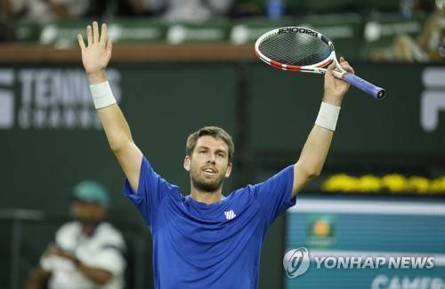 epa09529506 Cameron Norrie of Great Britain reacts after defeating Nikoloz Basilashvili of Georgia during the men's final at the BNP Paribas Open tennis tournament at the Indian Wells Tennis Garden in Indian Wells, California, USA, 17 October 2021. EPA/RAY ACEVEDO