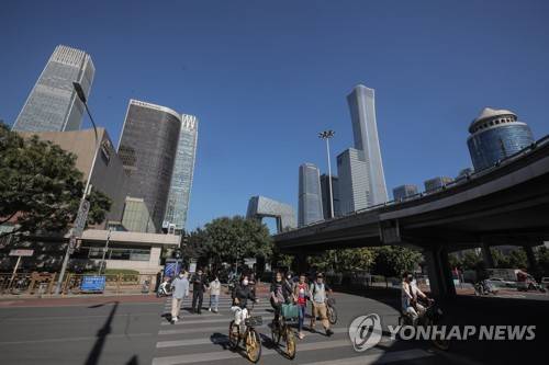 epaselect epa09529483 People walk and ride bicycles in the central business district (CBD) in Beijing, China, 17 October 2021 (issued 18 October 2021). China's gross domestic product (GDP) rose 4.9 percent year on year in the third quarter of 2021, according to data from the National Bureau of Statistics (NBS) issued on 18 October 2021. EPA/WU HONG