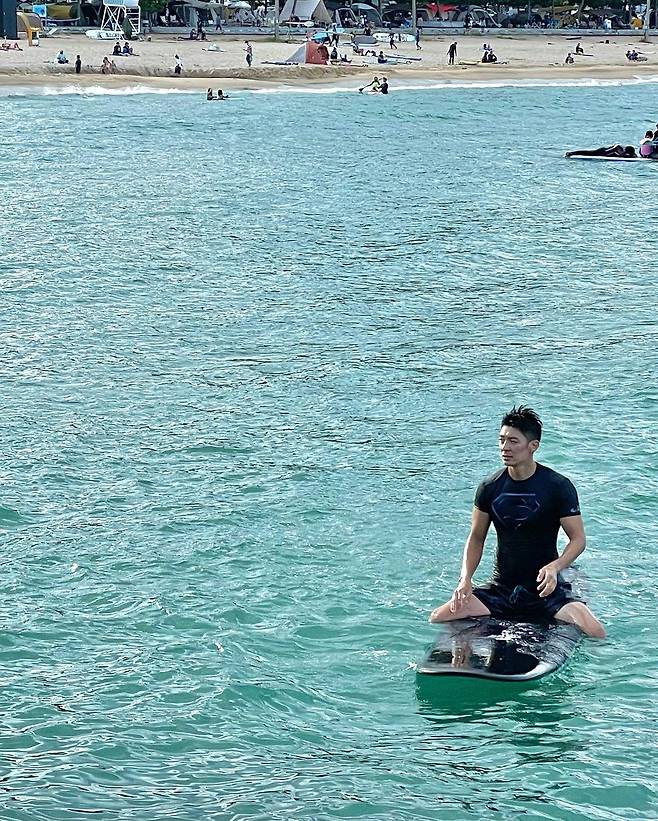 공개된 사진 속 팀은 강원도 양양 죽도해변에서 서핑보드 위에 올라탄 채 포즈를 취한 모습이다. 떡 벌어진 그의 어깨에 보는 이들의 시선이 모였다.