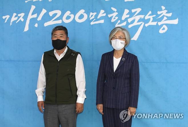 (서울=연합뉴스) 이정훈 기자 = 강경화 국제노동기구(ILO) 사무총장 후보가 18일 오후 서울 영등포구 한국노총을 방문, 김동명 위원장과 면담하기에 앞서 기념촬영을 하고 있다. 2021.10.18