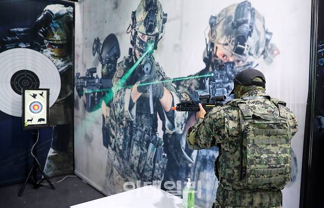 [이데일리 방인권 기자] 18일 경기도 성남시 서울공항에서 열린 서울 국제항공우주 및 방위산업전시회 2021(서울 ADEX)에서 한 군인이 레이저 사격을 선보이고 있다.