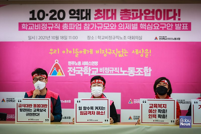 18일 전국학교비정규직노동조합원들이 서울 용산구 갈월동 회의실에서 '학교비정규직 총파업 참가규모와 의제별 핵심요구안 발표 기자간담회'를 가졌다.